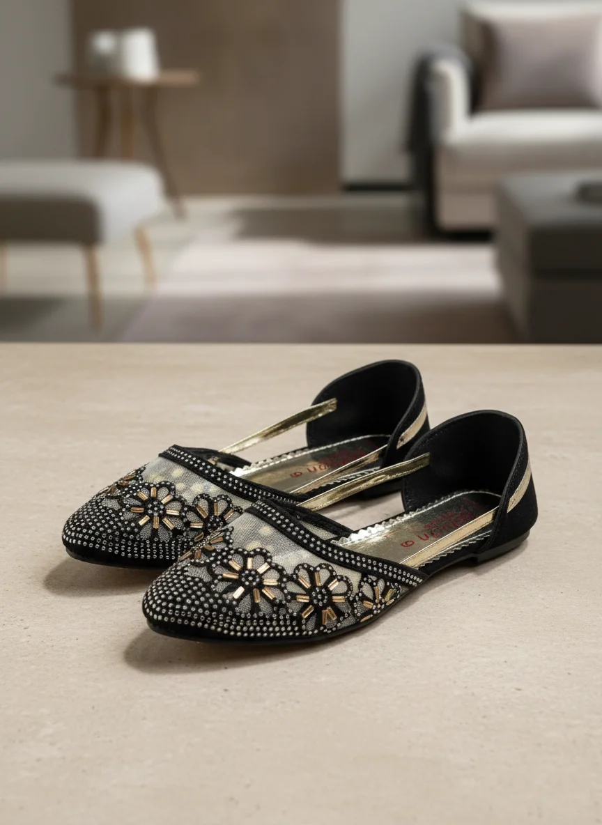 Elevate your festive wardrobe with these exquisitely crafted flats that perfectly blend traditional charm with modern sophistication. Featuring a delicate sheer mesh panel adorned with intricate floral beadwork and shimmering accents, these shoes offer a refined look without compromising on comfort. The sleek, d’Orsay-inspired silhouette and cushioned metallic insole make them an ideal choice for long celebrations or formal evenings. Whether you’re pairing them with ethnic wear or a polished fusion outfit, these flats add a touch of handcrafted luxury to every step.